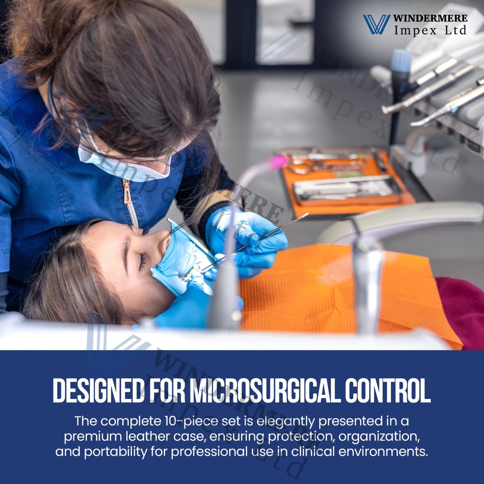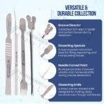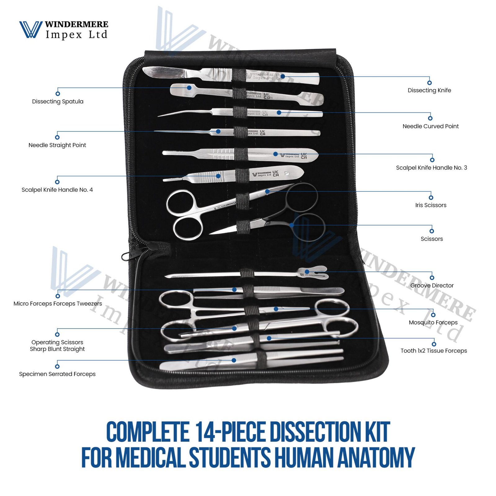 Each instrument in this dissecting set is ergonomically engineered to provide precise handling and maximum control during anatomical dissections, surgical training, and laboratory applications. The kit is neatly organized in a luxurious leather case, offering a professional appearance along with protection, cleanliness, and easy portability.