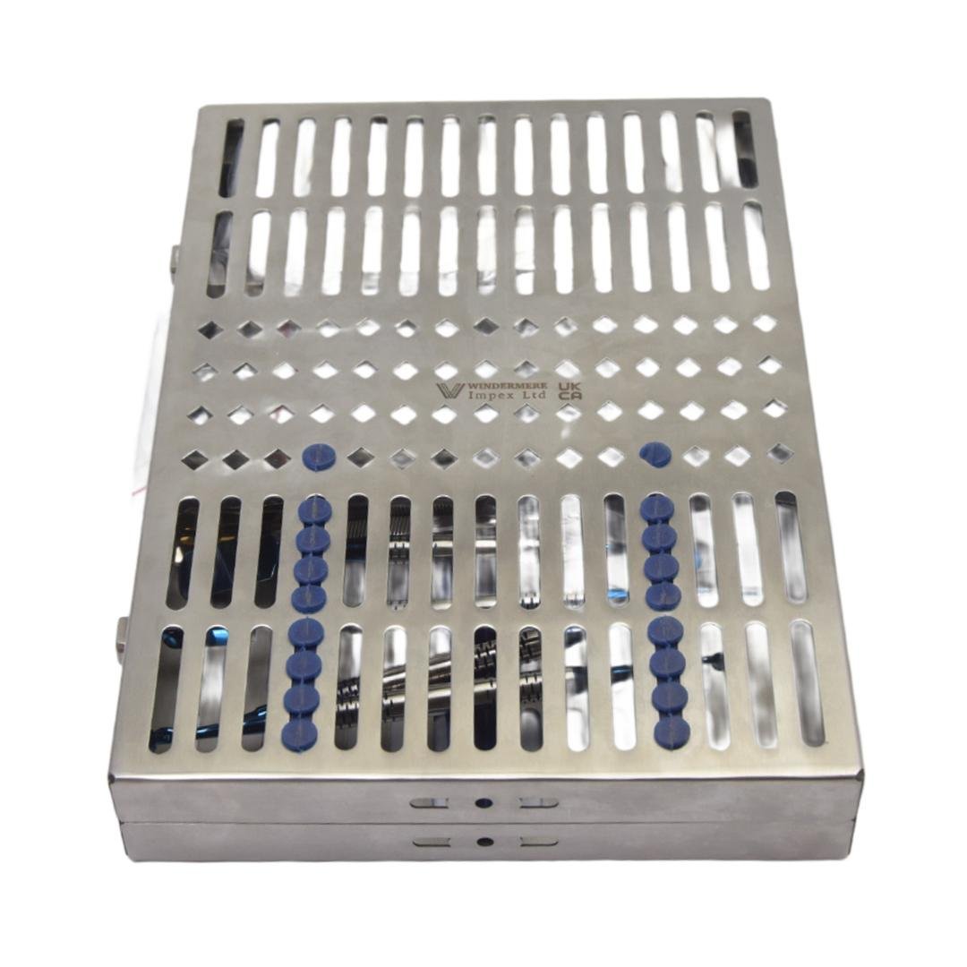 Each instrument in this collection is carefully balanced for ergonomic handling and consistent performance in oral surgery, implantology, and regenerative dental procedures. The instruments are housed in a stainless steel sterilization cassette, ensuring safety, organization, and easy sterilization during clinical use.