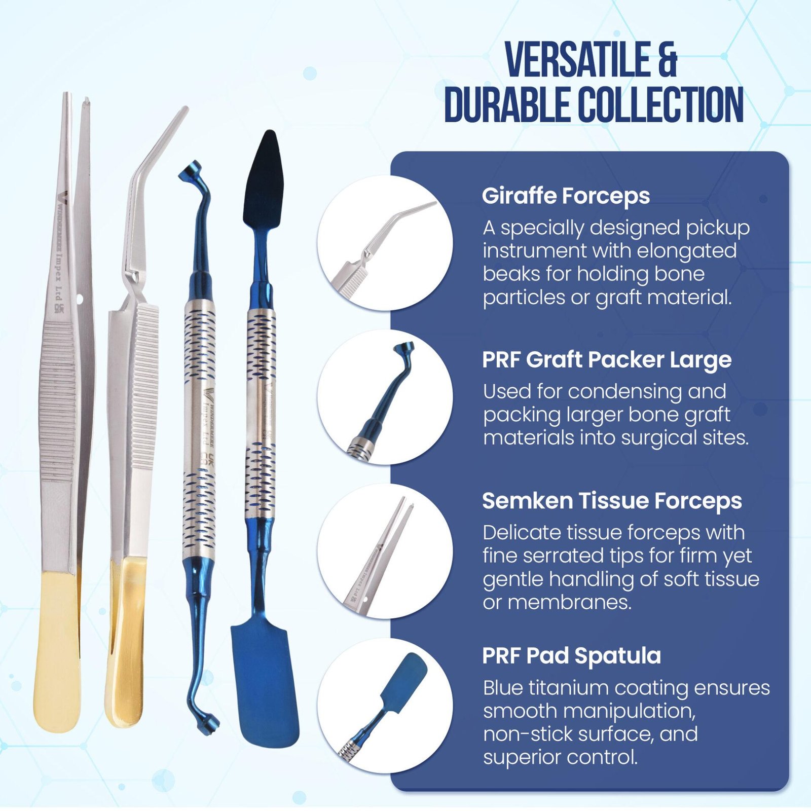 • Autoclavable and corrosion-resistant instruments for long-term clinical use