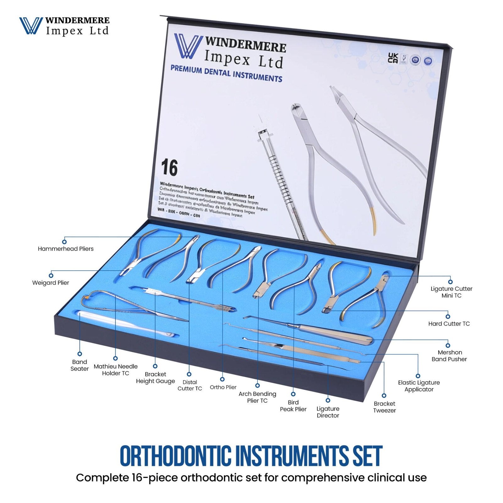 The Windermere Impex Ltd Orthodontic Instruments Set of 16 is a premium-quality, precision-engineered collection of essential orthodontic tools designed to assist dental professionals in performing a wide range of orthodontic procedures with accuracy, efficiency, and comfort. Each instrument in this comprehensive set is crafted from high-grade German stainless steel, ensuring exceptional durability, corrosion resistance, and full autoclave compatibility for long-term clinical use.