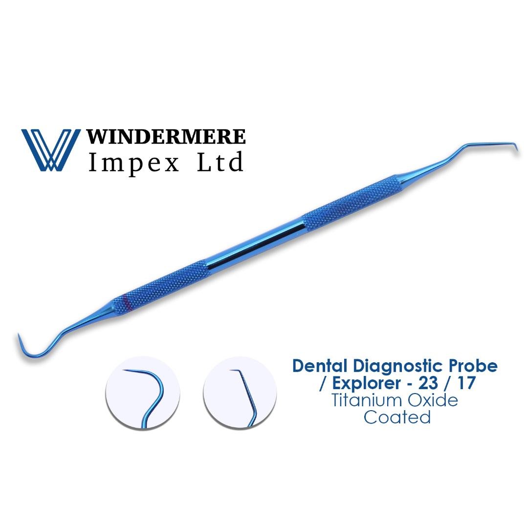 Windermere Impex Dental Explorer 23/17A features a dual-ended design with the #23 Shepherd’s Hook and #17A Right Angle tips for comprehensive examination. The titanium oxide coating enhances strength, corrosion resistance, and aesthetic appeal while preserving high tactile sensitivity for accurate detection.