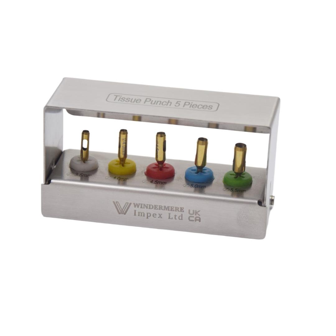 The Windermere Impex Ltd Dental Implant Tissue Punch kit is a precision-engineered surgical instrument kit designed for clean, accurate, and minimally invasive soft tissue removal during dental implant procedures. It allows clinicians to create precise circular incisions in the gingiva for implant placement or exposure while preserving tissue integrity and promoting optimal healing.