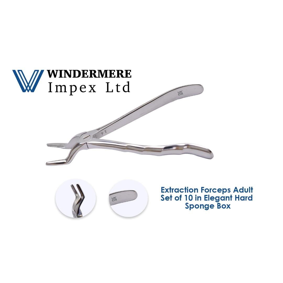 The Windermere Impex Ltd Extraction Forceps Adult Set of 10 is a professional-grade dental instrument kit meticulously designed for precision, strength, and control during tooth extraction procedures. Each forceps is crafted from premium German quality surgical stainless steel, ensuring long-lasting performance, superior corrosion resistance, and full autoclave compatibility for complete infection control.
