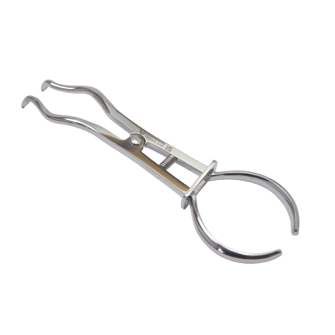 Universal molar clamp featuring serrated jaws for improved grip on irregularly shaped or partially erupted molars.
